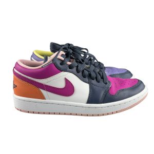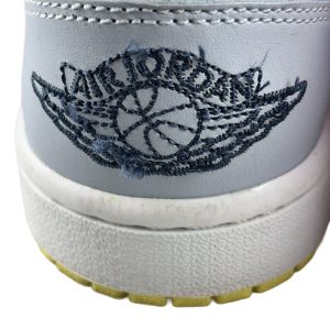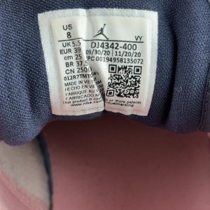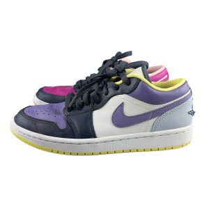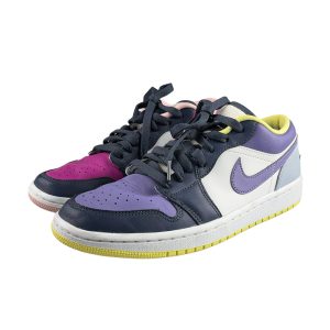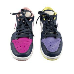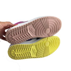 - Couro nas cores branco e azul marinho, com detalhes na toebox, gola e Swoosh em lilás e cinza no pé esquerdo e rosa e laranja no pé direito. Entressolas em borracha na cor branca e solas em borracha nas cores amarela no pé esquerdo e rosa claro no pé direito;