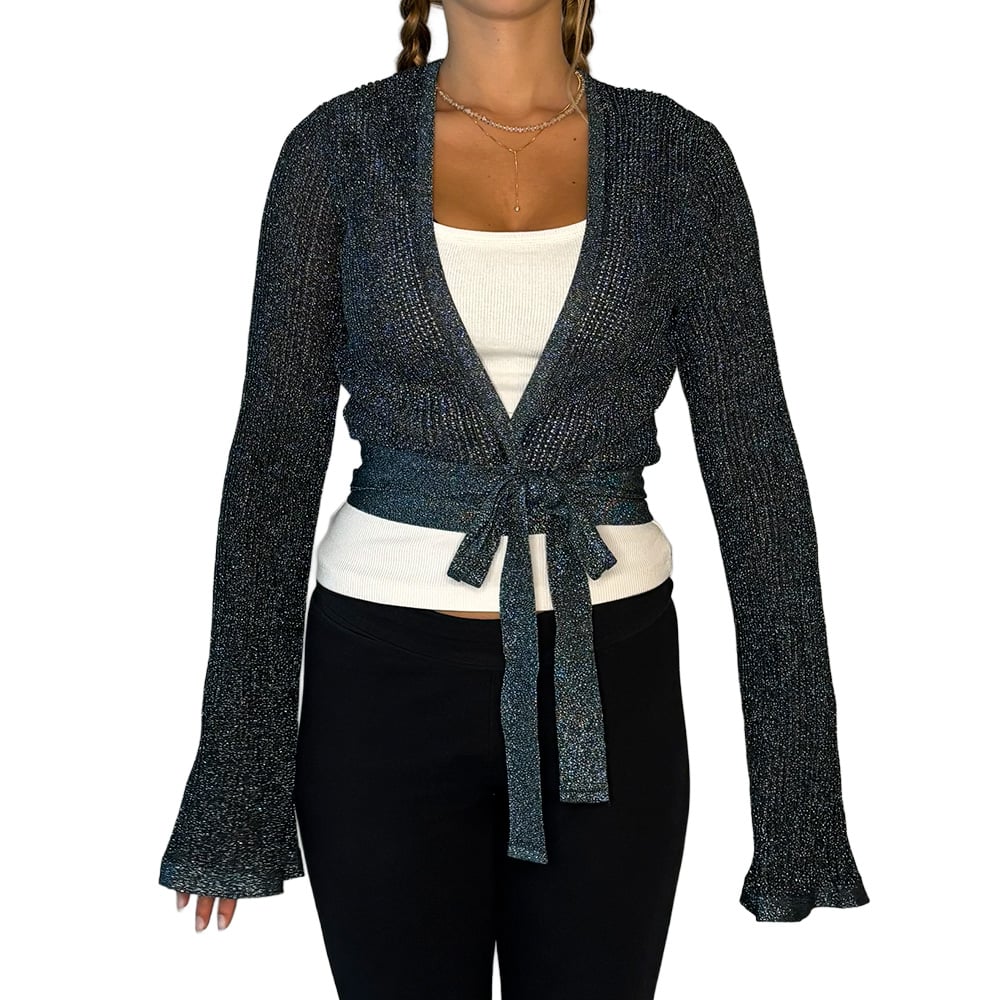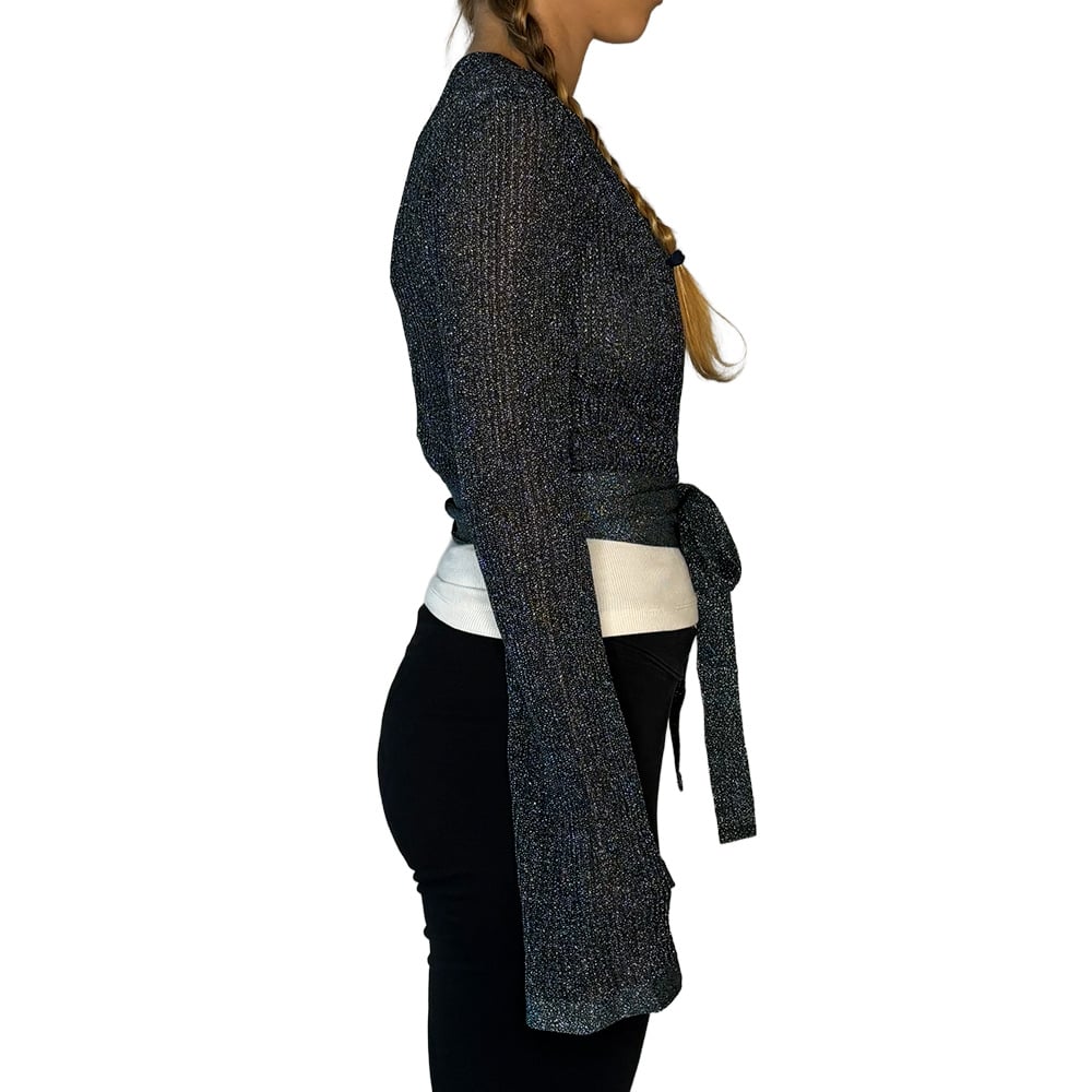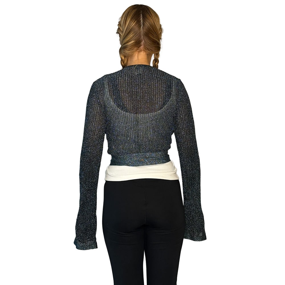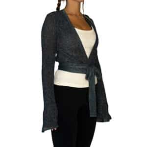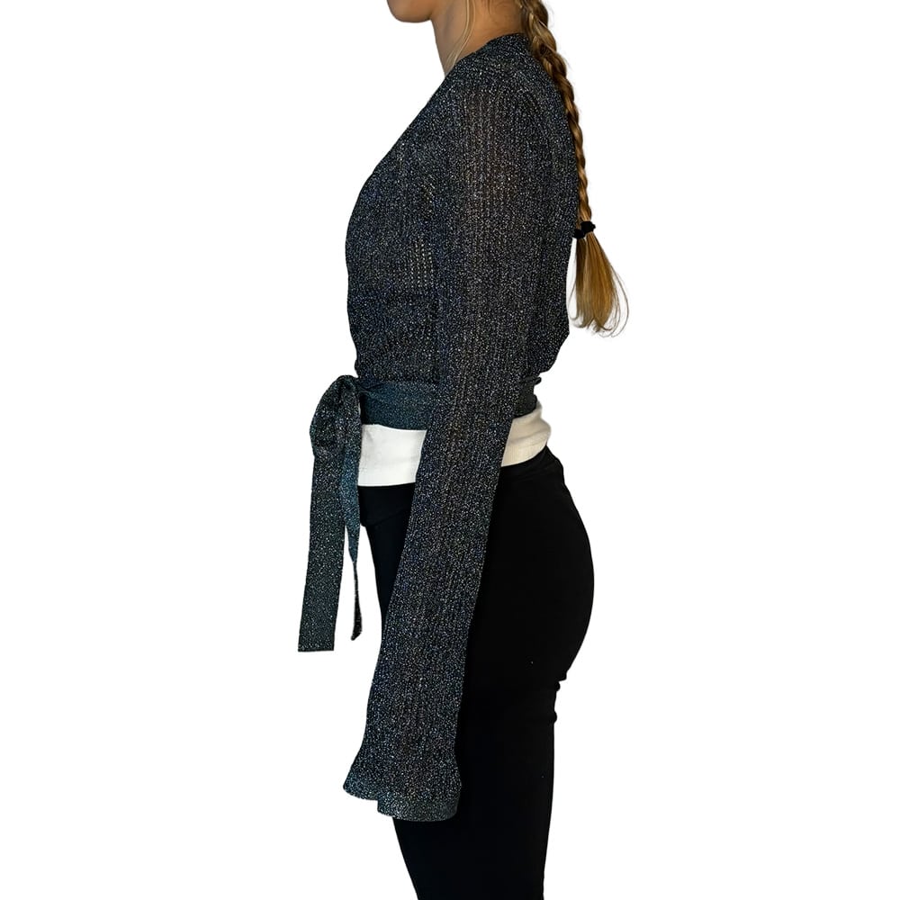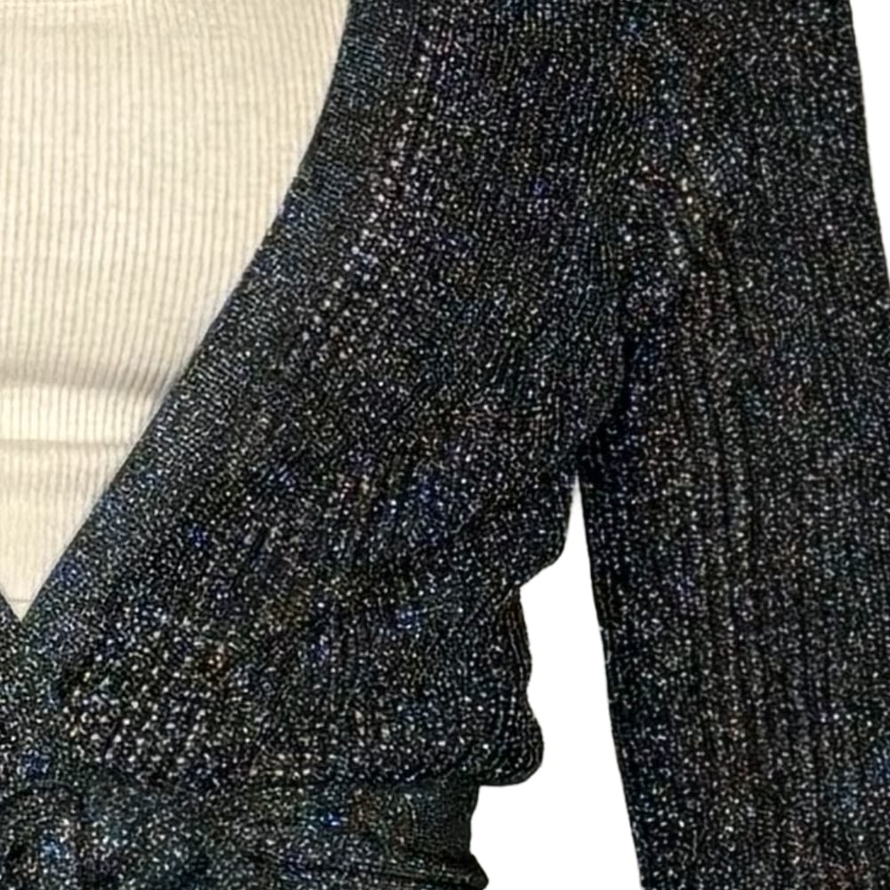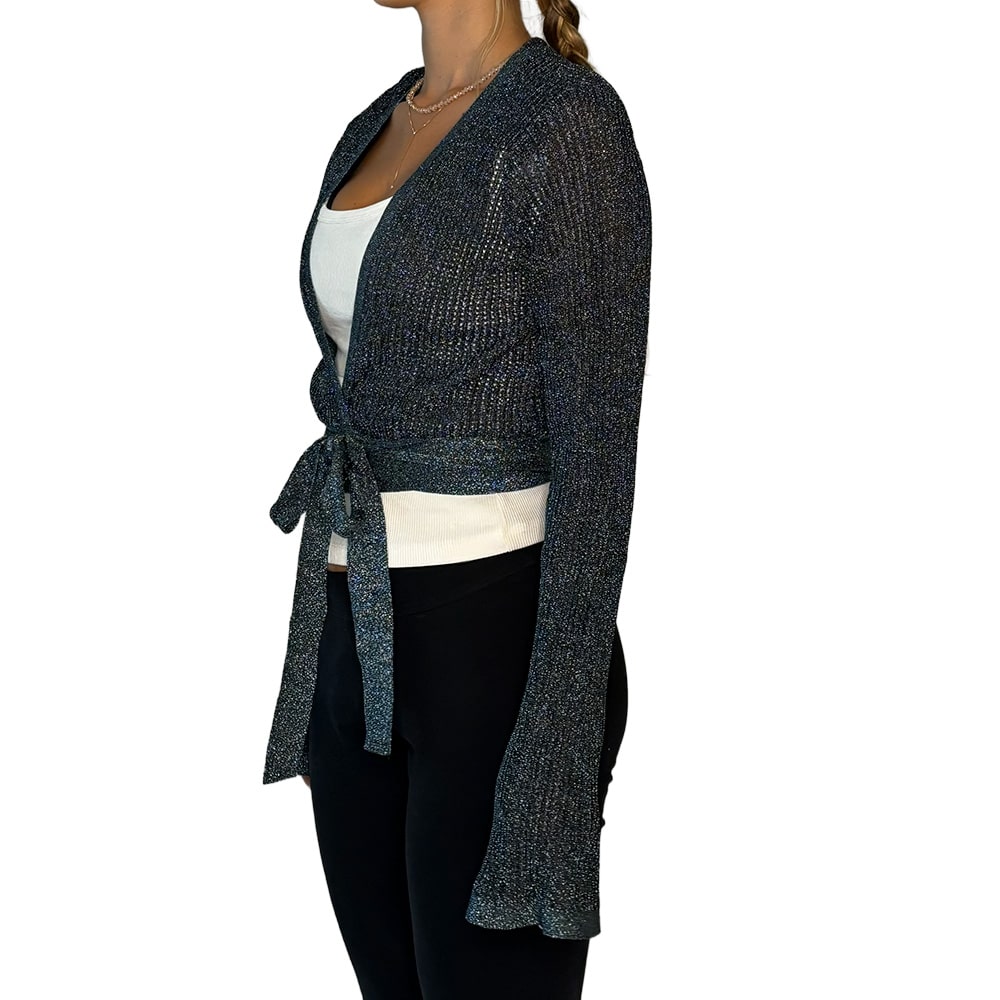 - Possui modelagem cropped, cachecoeur (transpassada) com amarração, mangas longas e detalhe prateado em tricot com lurex na barra e punhos;