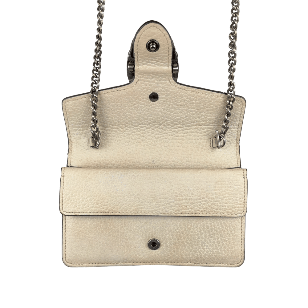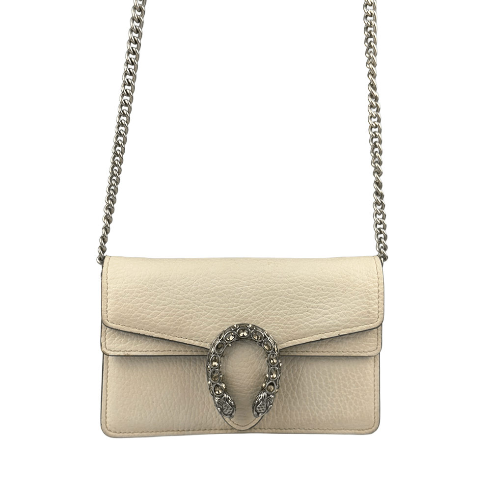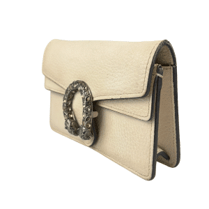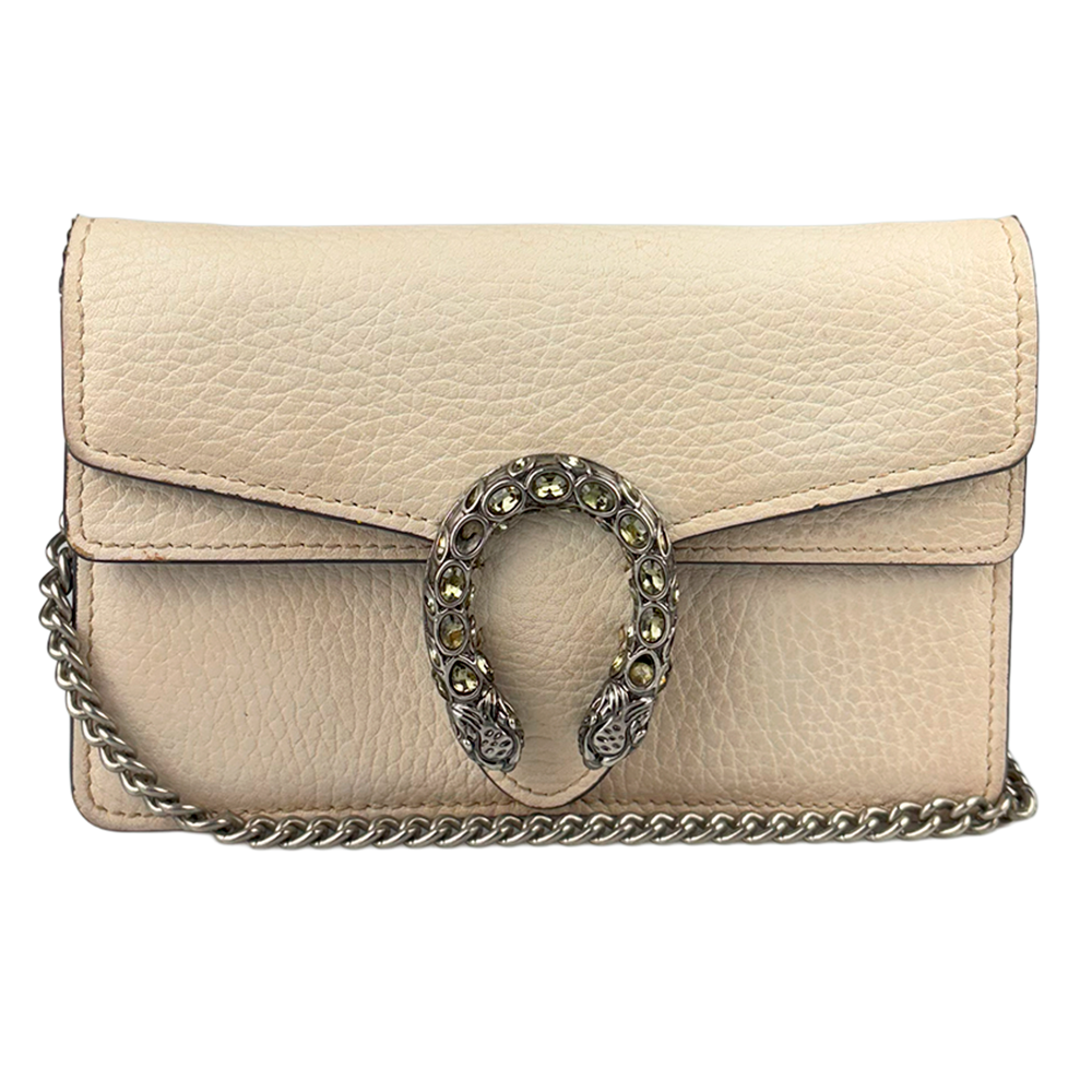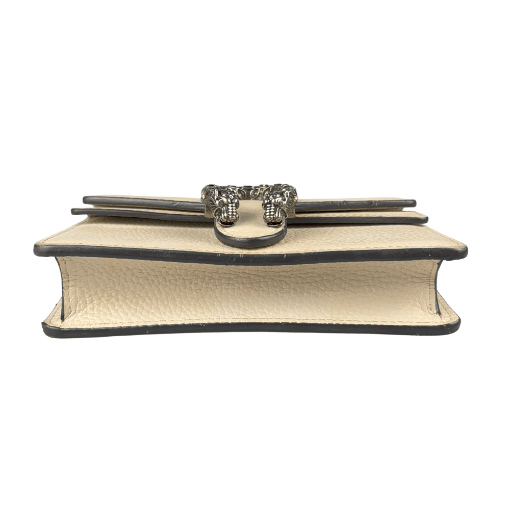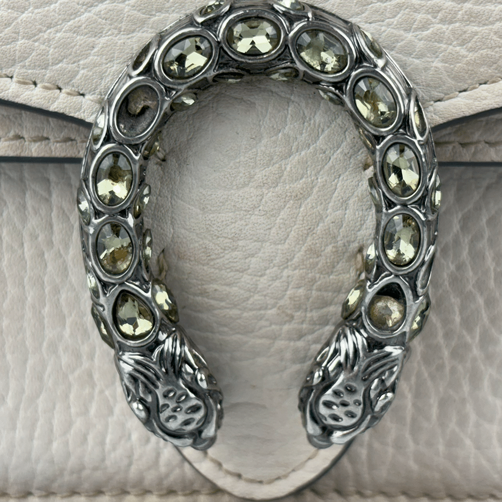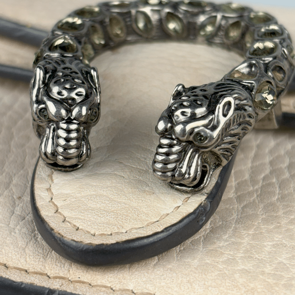 - Criada por Alessandro Michele em 2015, a bolsa Gucci Dionysus reflete a proposta de integrar a herança da marca a uma estética contemporânea e eclética. O fecho em formato de cobra com cabeça de tigre, com cristais, faz referência ao mito do deus Dioniso – deus grego do vinho, teatro e celebração, que cruzou o rio Tigre montado em um tigre enviado por Zeus.