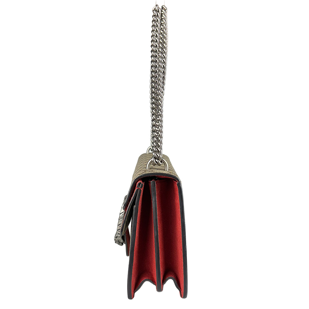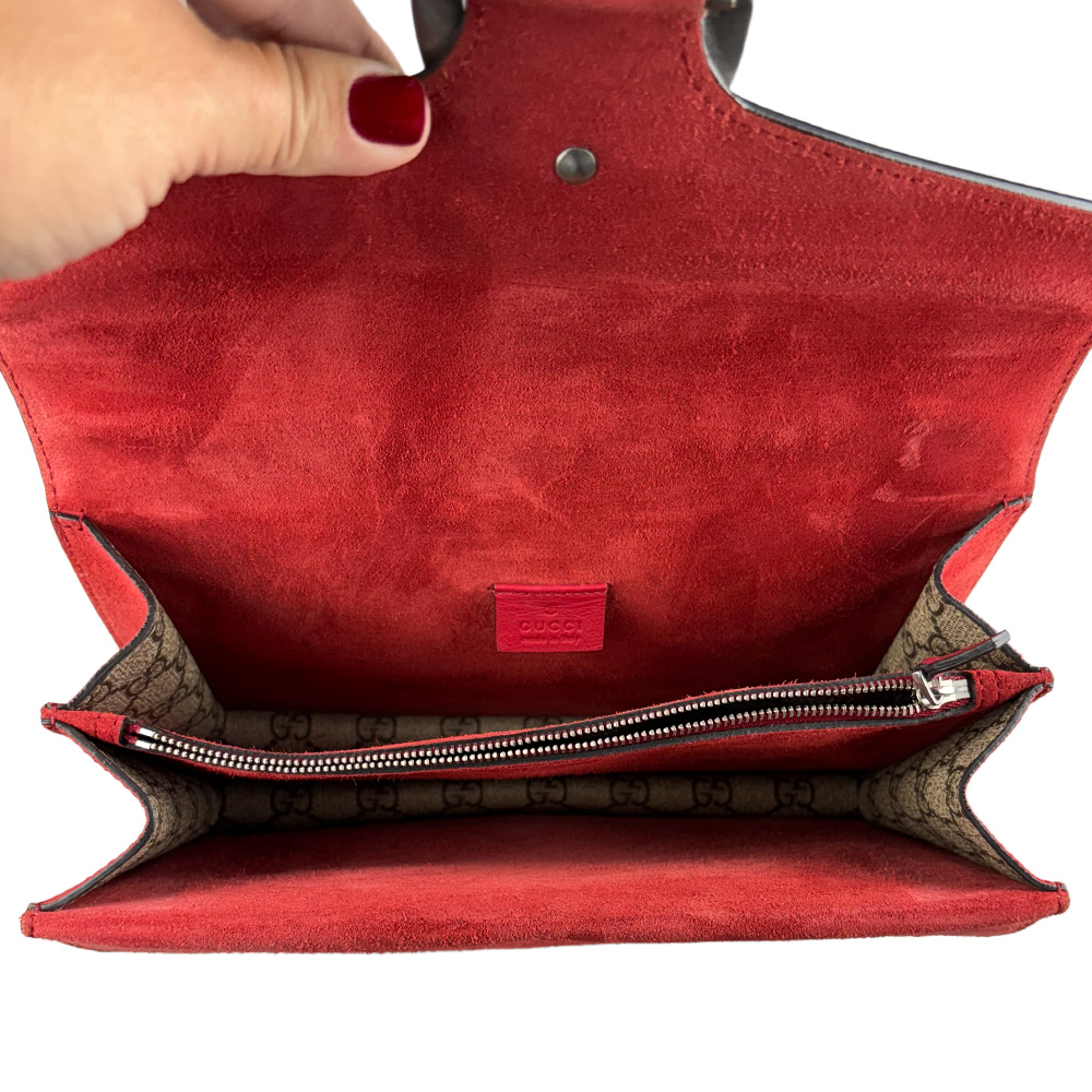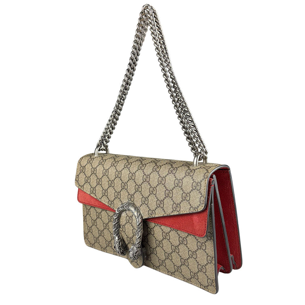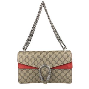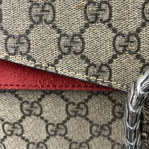 - Criada por Alessandro Michele em 2015, a bolsa Gucci Dionysus reflete a proposta de integrar a herança da marca a uma estética contemporânea e eclética. O fecho em formato de cobra com cabeça de tigre, com cristais, faz referência ao mito do deus Dioniso – deus grego do vinho, teatro e celebração, que cruzou o rio Tigre montado em um tigre enviado por Zeus.