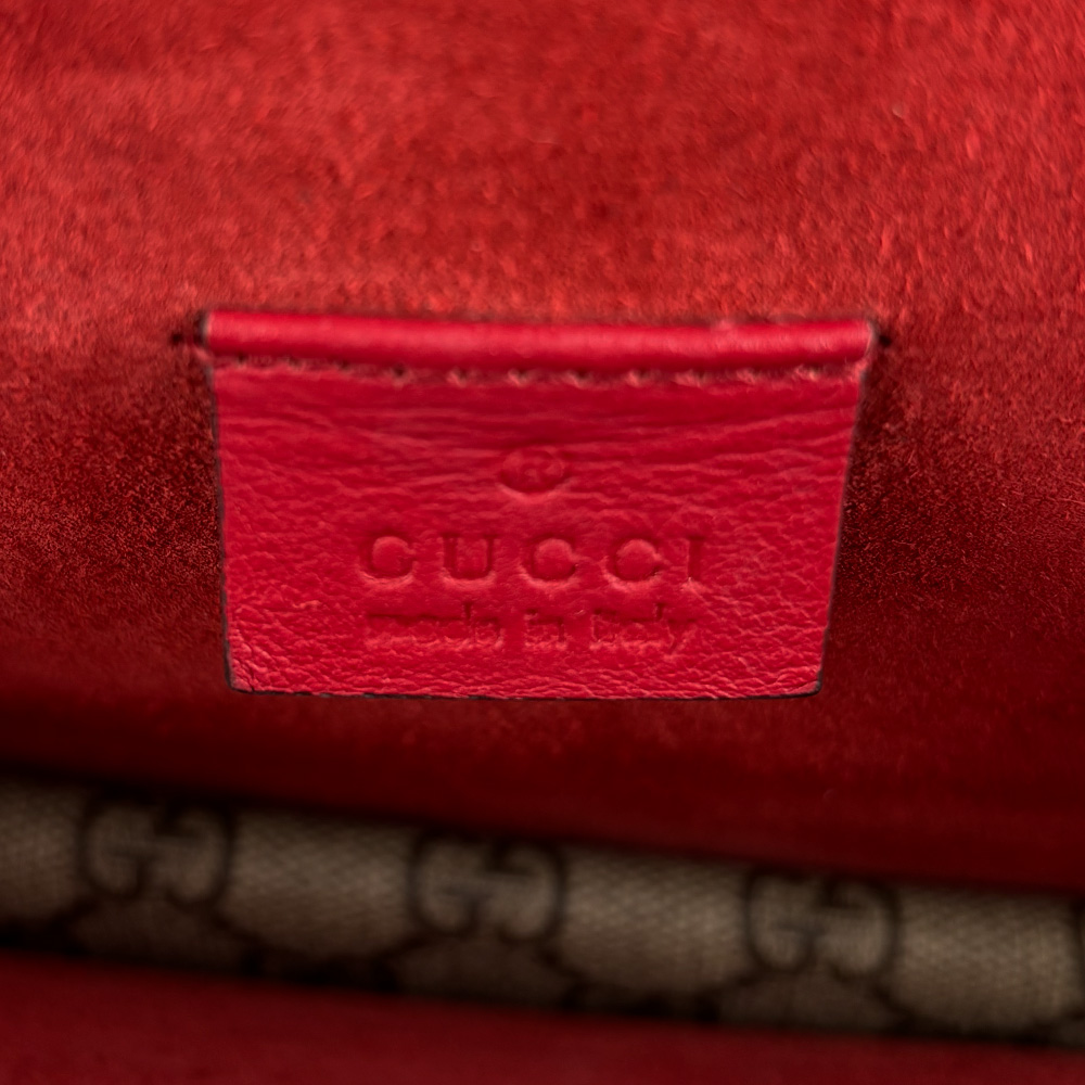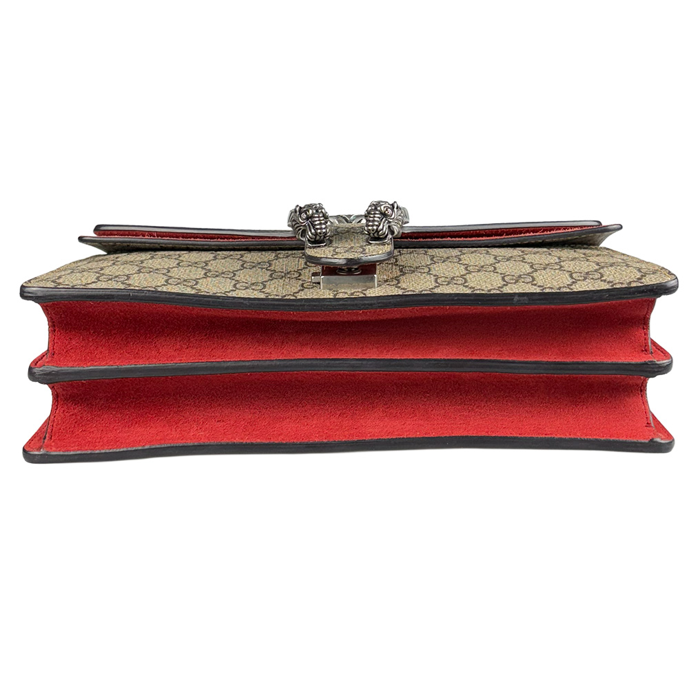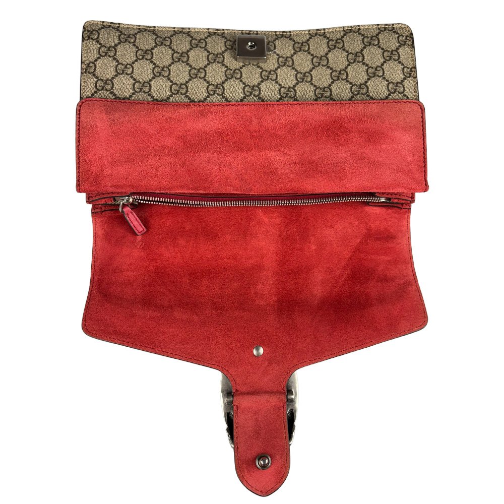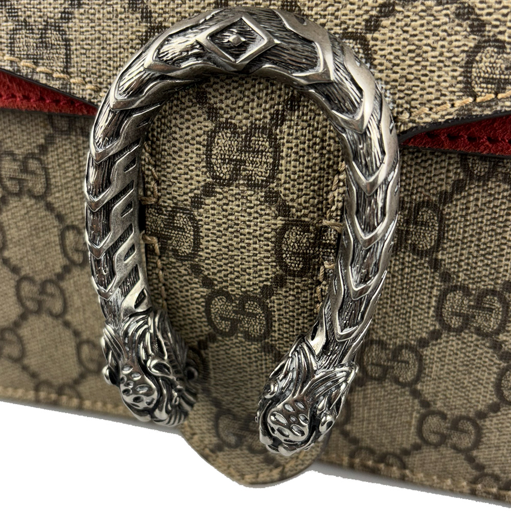 - Criada por Alessandro Michele em 2015, a bolsa Gucci Dionysus reflete a proposta de integrar a herança da marca a uma estética contemporânea e eclética. O fecho em formato de cobra com cabeça de tigre, com cristais, faz referência ao mito do deus Dioniso – deus grego do vinho, teatro e celebração, que cruzou o rio Tigre montado em um tigre enviado por Zeus.