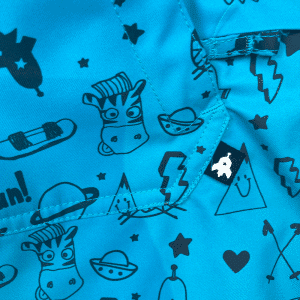Tecido tecnológico com estampa nas cores azul e preto e detalhes na cor amarelo;