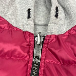 - Possui modelagem bomber, com cursor frontal, dois bolsos frontais e dois bolsos internos com fechamento por botão de pressão e capuz fixo na cor cinza.;