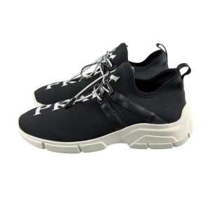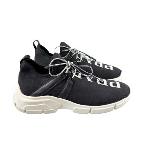 - Knit (tecido estilo tricô maquinetado) na cor preta com logo na cor branca frontal e sola em borracha na cor branca;