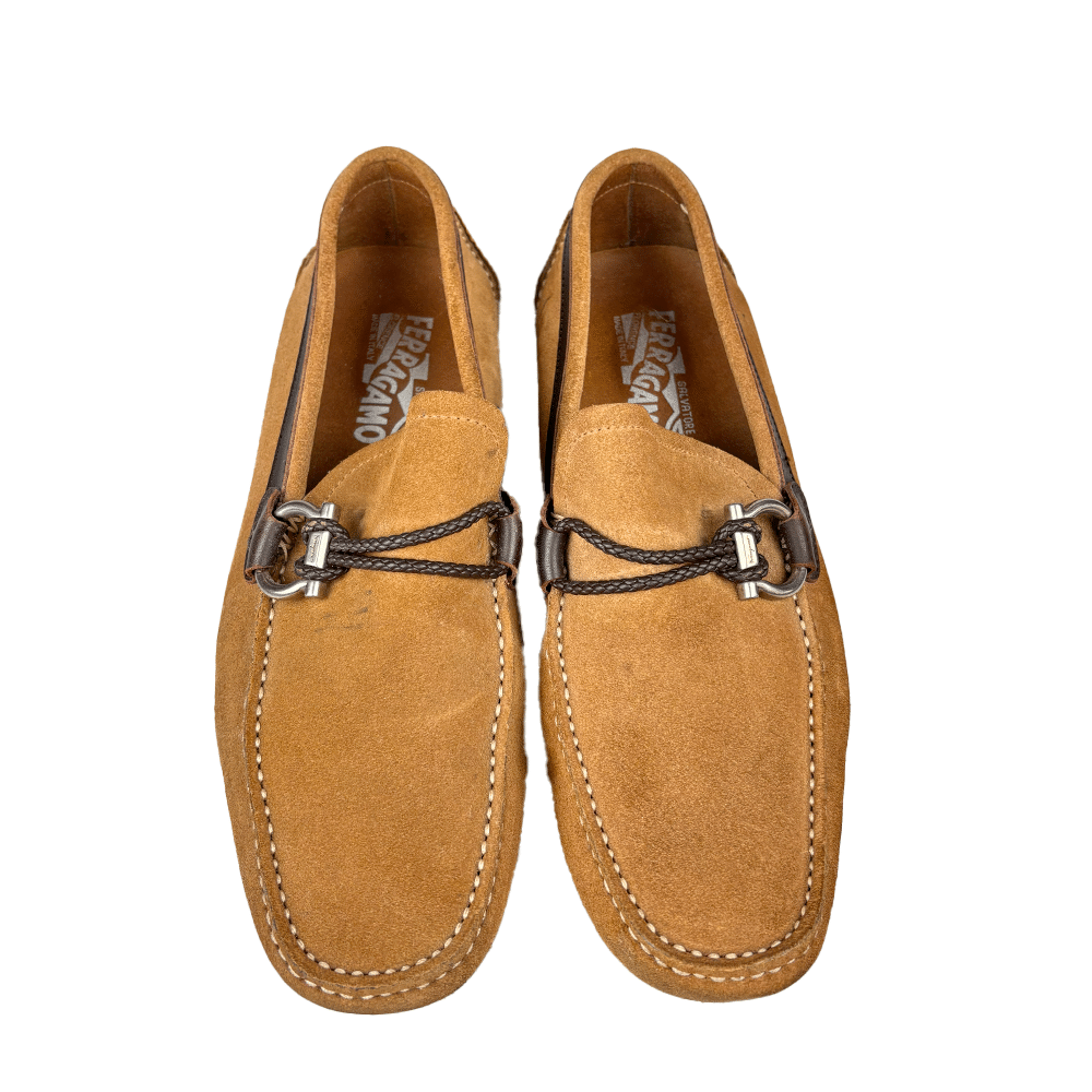 - Suede na cor caramelo, couro marrom e detalhe em Gancini na cor prateada;