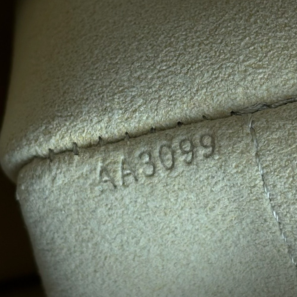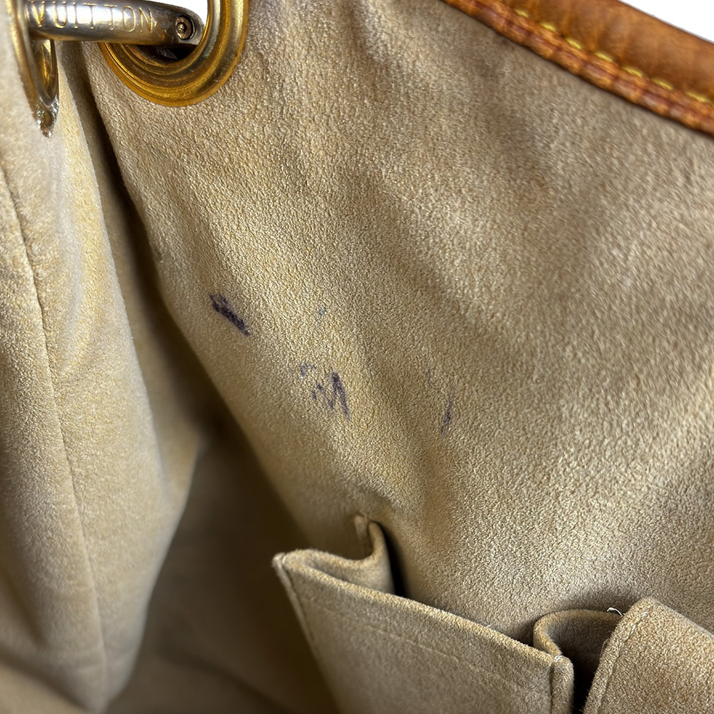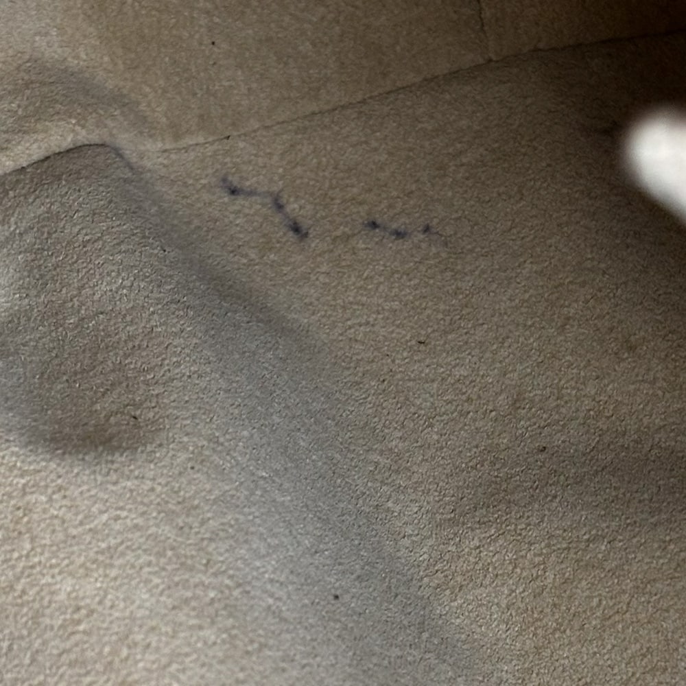 Apresenta escurecimento e desgastes nos detalhes em couro vachetta, descascamento nas ferragens, manchas no interior, canvas e detalhes em couro vachetta.