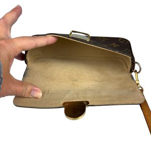 - Possui alça wristlet em couro Vachetta;