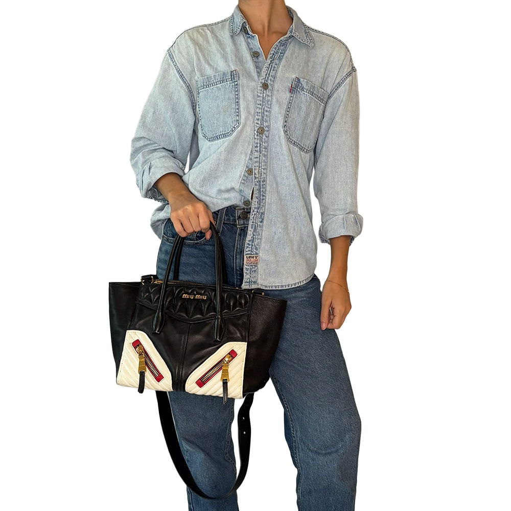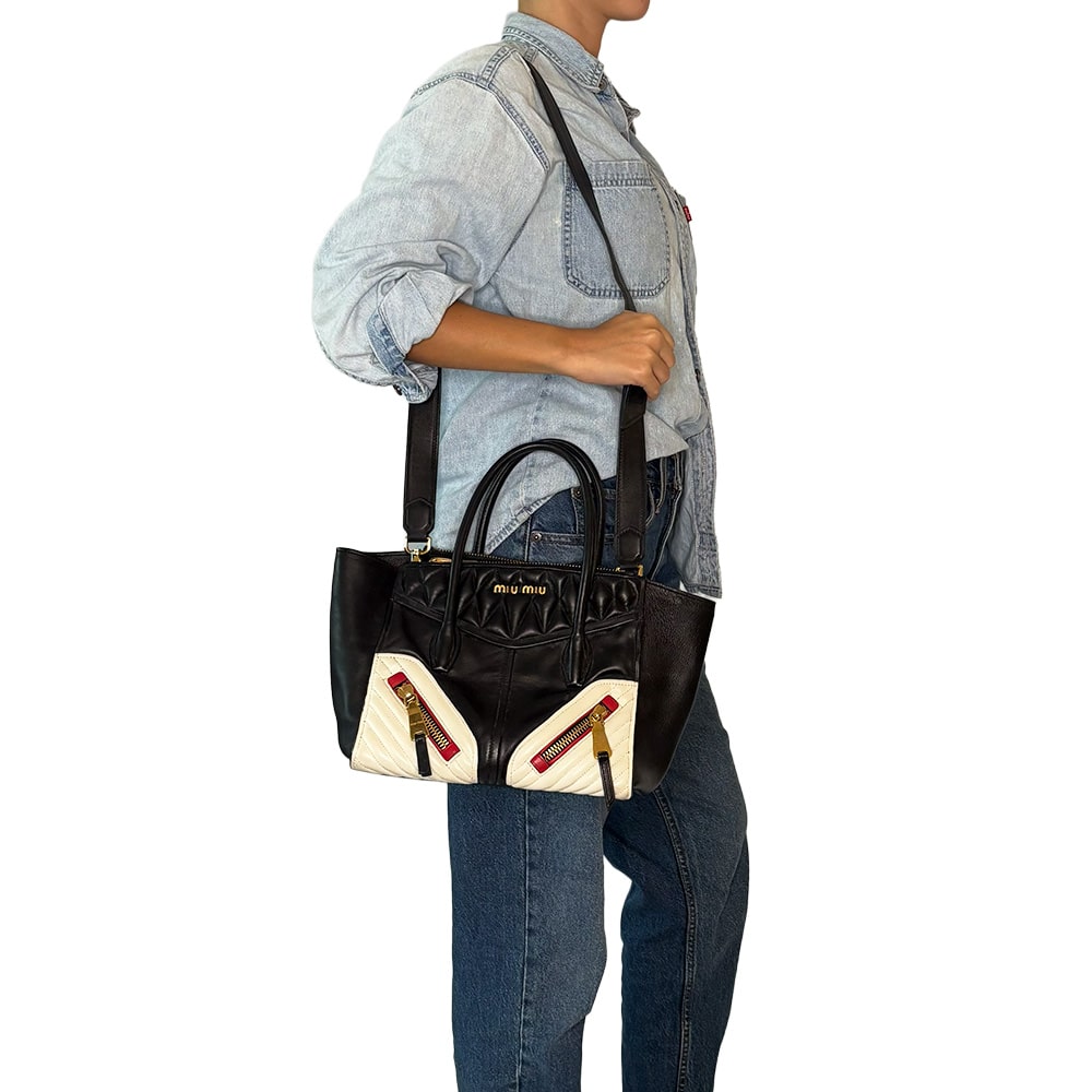 - Couro Nappa nas cores Nero (preta) e Bianco (branco), com detalhes em Fuoco (vermelho);