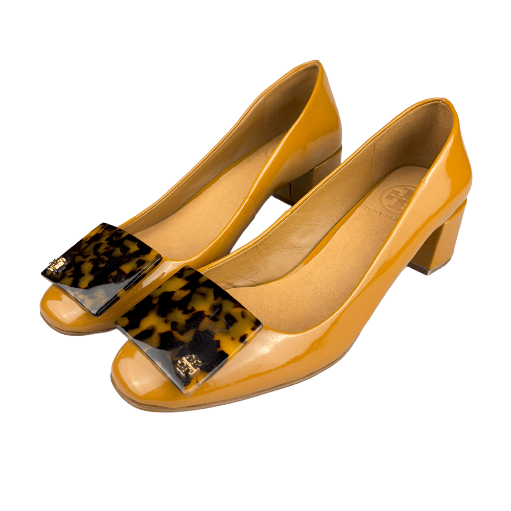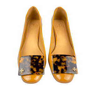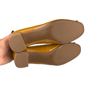 - Couro Patent na cor bege e detalhe frontal em acrílico;