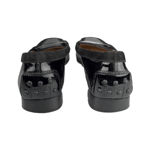 - Couro envernizado e suede na cor preta;