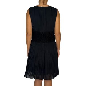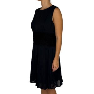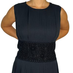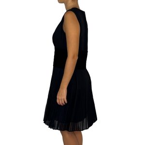 - Modelagem curta acinturada, sem mangas, com decote canoa e saia plissada;