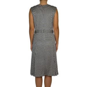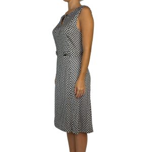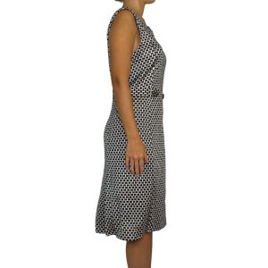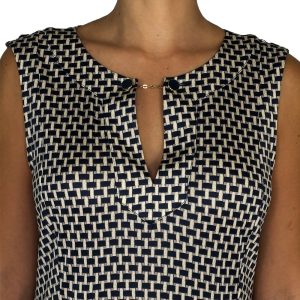 - Modelagem acinturada, sem mangas, com decote em V com detalhe em metal, detalhe de tira e botões metálicos na cintura;