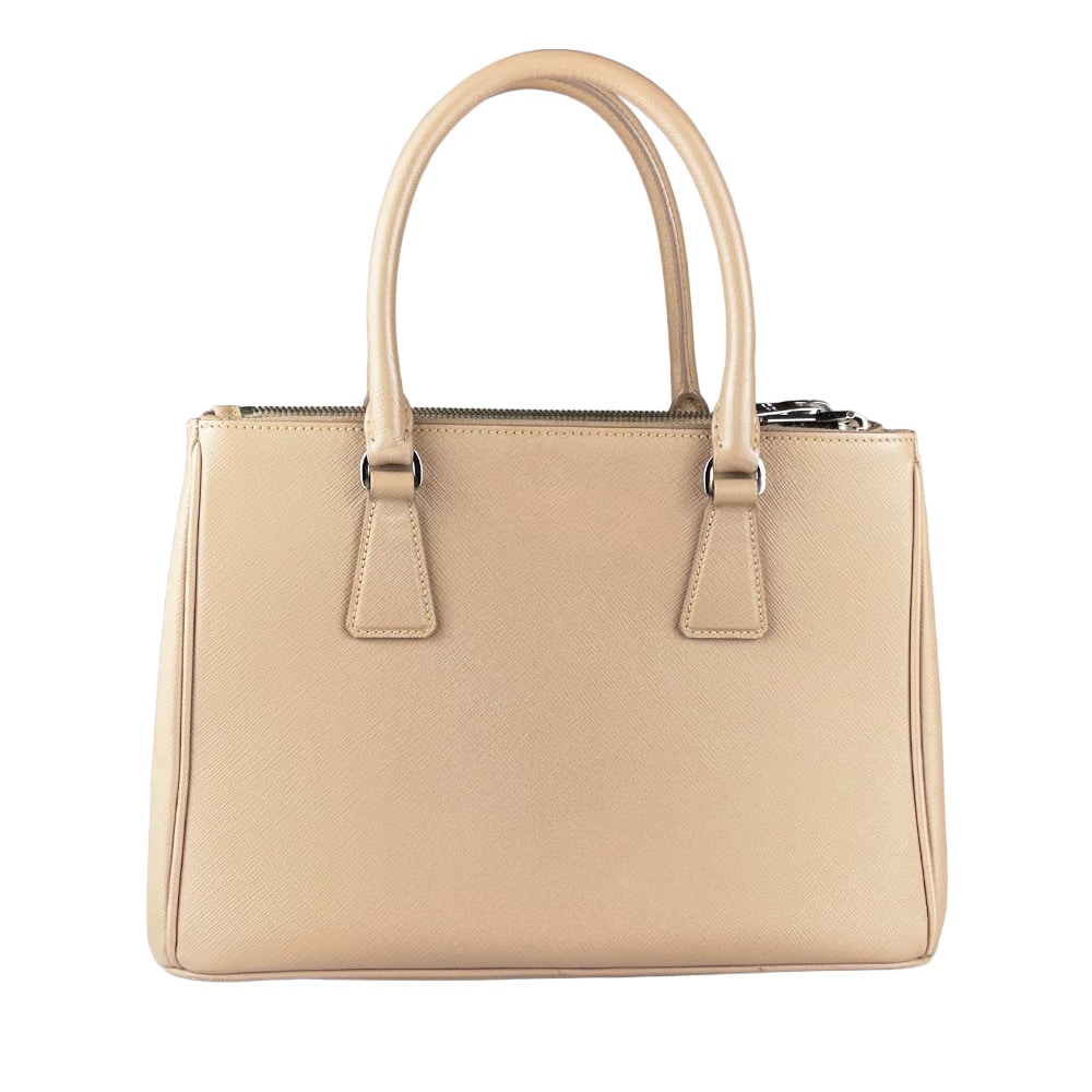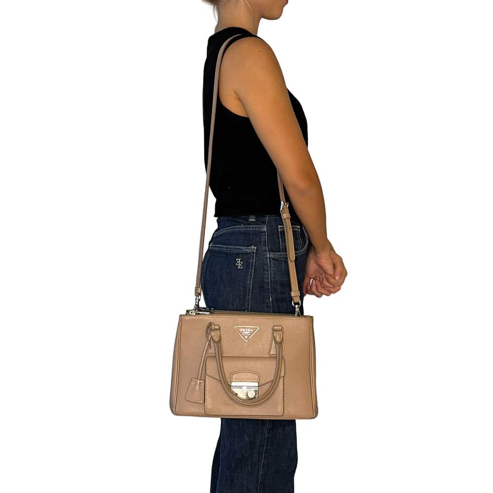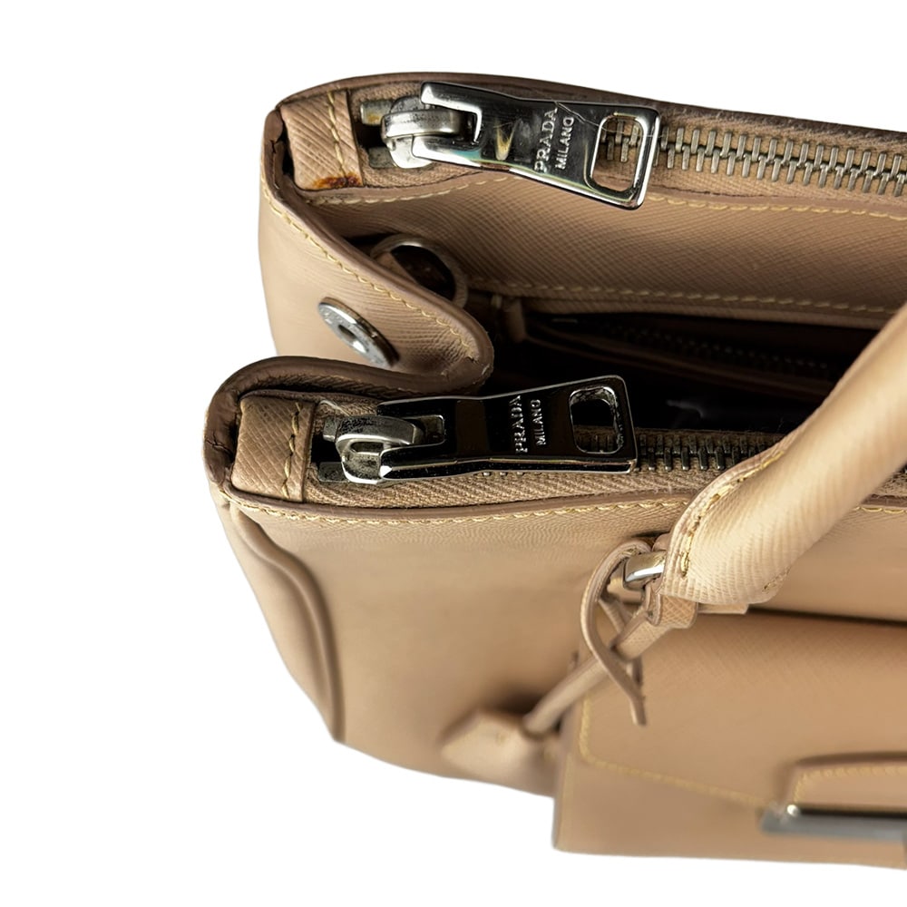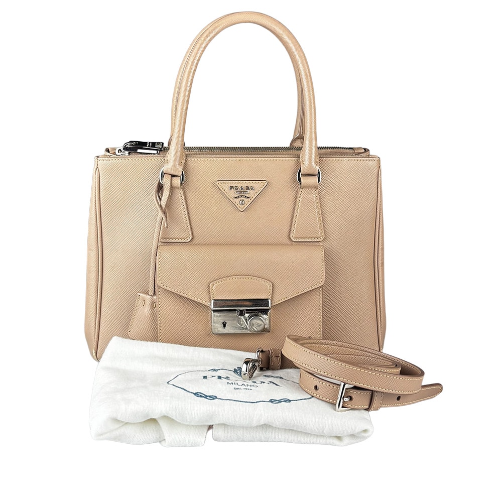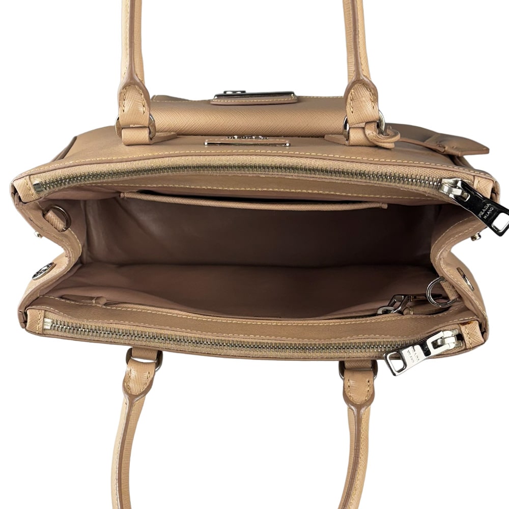 - Alça dupla de mão e alça longa removível regulável de ombro em couro Saffiano;