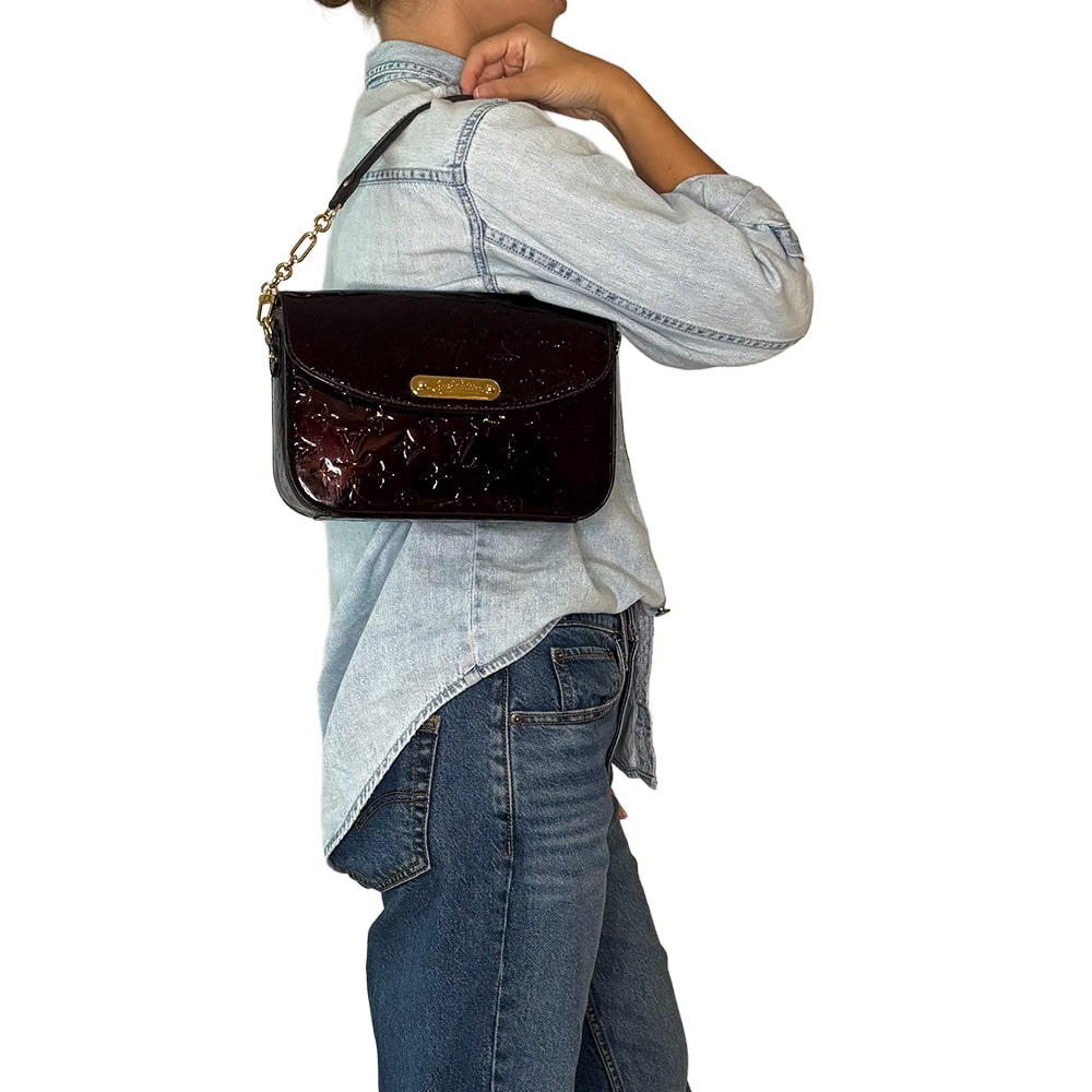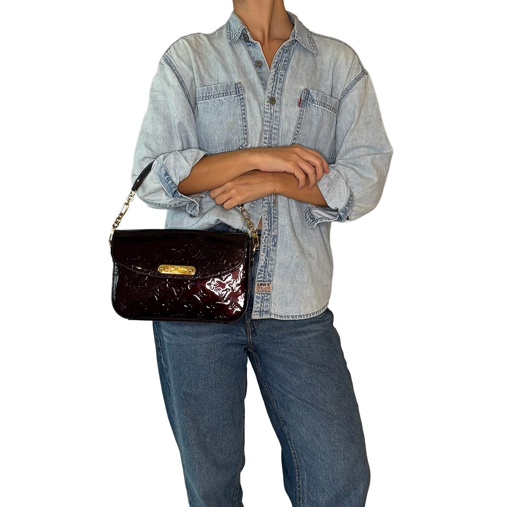 - Vernis (couro envernizado com padronagem Monogram em baixo relevo) na cor Amarante (vinho);