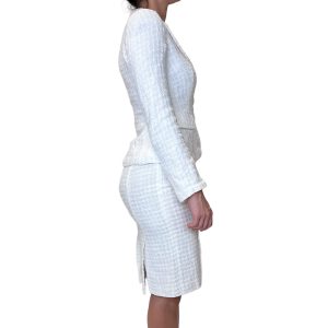 - Fechamento do blazer single breasted por 3 botões frontais e fechamento da saia por botão de segurança e cursor na parte de trás;